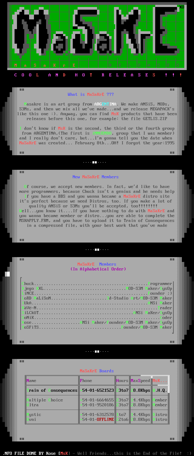 like this one :. Anyway, you can find MsK products that have been releases before this one, for example: the file GETLIS.ZIP I dont know if MsK is the second, the third or the fourth group from ARGENTINA,The first is iNNUENDO, group that I was member