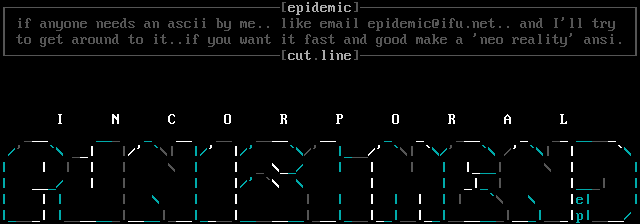 epidemic if anyone needs an ascii by me.. like email epidemic@ifu.net.. and Ill try to get around to it..if you want it fast and good make a neo reality ansi. cut.line