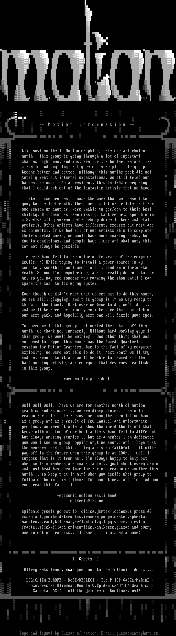 LOGiC/TEA EUROPE DoZE/DEFLECT T.a.P,TPP,GaZZa/MYRiAD Proze,Fractal,Blindman,Double 0,Epidemic/MOTiON Graphics Gangstar/ACiD All the juicers on motion/ansi! -- Logo and layout by Quasar of Motion. E-Mail quasar@dataphone.se --