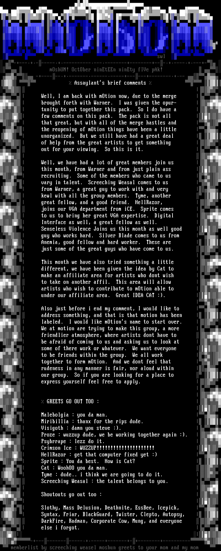 -+---+------+---------------------+--------+---+----+---+- mOshUN! OctOber ninEtEEn ninEty fIVe pAk! -+------+------------------+------+--------+-- Assaylants brief comments Well, I am back with mOtion now, due to the merge brought forth with Warner. I was given the opur-