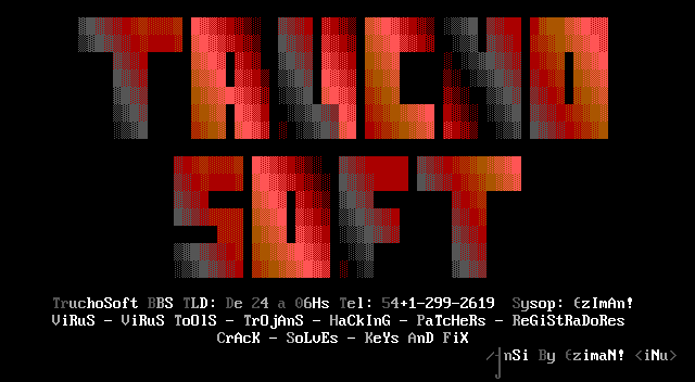 TruchoSoft BBS TLD: De 24 a 06Hs Tel: 54+1-299-2619 Sysop: zImAn!