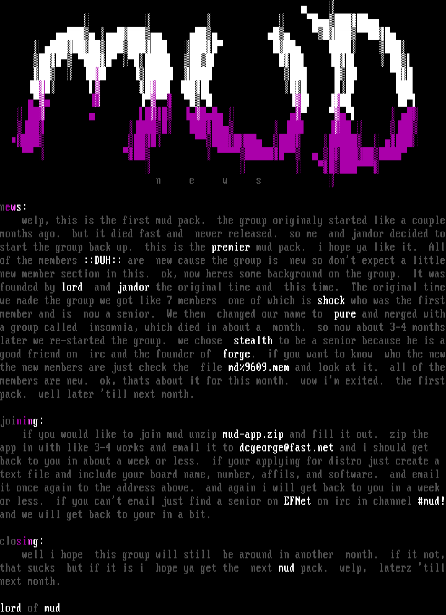 welp, this is the first mud pack. the group originaly started like a couplemonths ago. but it died fast and never released. so me and jandor decided tostart the group back up. this is the premier mud pack. i hope ya like it. Allof the members ::DUH:: are new cause the group is new so dont expect a littlenew member section in this. ok, now heres some background on the group. It wasfounded by lord and jandor the original time and this time. The original timewe made the group we got like 7 members one of which is shock who was the firstmember and is now a senior. We then changed our name to pure and merged witha group called insomnia, which died in about a month. so now about 3-4 monthslater we re-started the group. we chose stealth to be a senior because he is agood friend on irc and the founder of forge. if you want to know who the newthe new members are just check the file md9609.mem and look at it. all of themembers are new. ok, thats about it for this month. wow im exited. the firstpack. well later till next month.