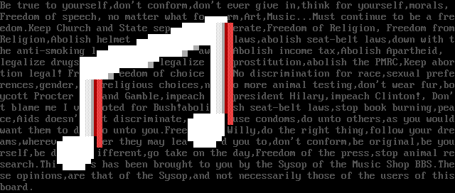 legalize drugslegalize prostitution,abolish the PMRC,Keep abortion legal! Freedom of choice No discrimination for race,sexual preferences,gender,religious choices,no more animal testing,dont wear fur,boycott Procter and Gamble,impeach president Hilary,impeach Clinton!, Dont blame me I voted for Bush!abolish seat-belt laws,stop book burning,peace,Aids doesnt discriminate,use condoms,do unto others,as you wouldwant them to do unto you.FreeWilly,do the right thing,follow your dreams,wherever they may lead you to,dont conform,be original,be yourself,be different,go take on the day,Freedom of the press,stop animal research.This has been brought to you by the Sysop of the Music Shop BBS.These opinions,are that of the Sysop,and not necessarily those of the users of thisboard.