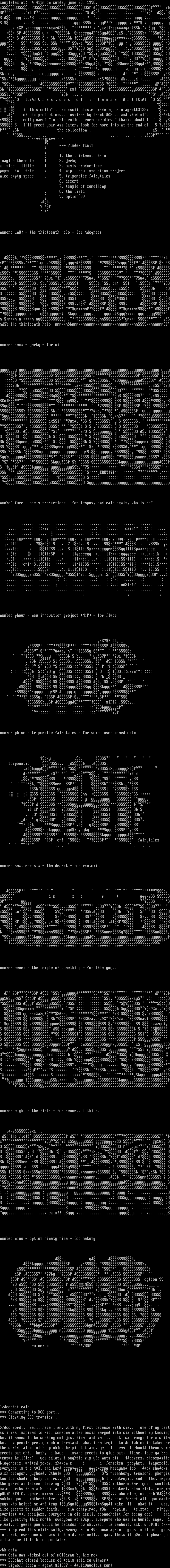 /dcc word.. well, here i am, with my first release with cia.. one of my bestas i was inspired to kill someone after oasis merged into cia without my knowingbut it seems to be working out just fine, and well.. it was rough for a whilebut now people pretty much understands what i am trying to do which is takeoverthe world, along with pinkies help but anyways, i guess i should throw somegreets out eh?.. hmph, i have insane greets to give out: flame, love ya bro.tempus hellfire?.. you idiot, i oughtta rip y0e nuts off. 4degrees, rheospasticbiogenesis, united powor, shamen c i a forsaken prophet, trapezoid,everyone in the 403, and Lord gggp*qggg gggp*qggg Narayana too, dark shadows,wish bringer, jughead, Cthulu yyy nuremberg, treason?, ghengistew for shading help on irc.. y ggggggggggggb:l .nootropic, and that negrothe guardian slave driving : 7P : motherfucker, you couldntcatch crabs from a 5 dollar lcn!yyb,:!ncl hooker, also blatz, enzymepOLYMORPHiC, spear, ummmm ::: yy ::: who else, oh yeah!@!mobius you motherfucker, :b: :?: P: cant forget all you oasisguys who helped me and temp lyymlyyyylmmyydl make it what it was,also greets to sudden death, cia conspiracy 36 napalm, telstar , ringy,everlast , acidjazz, everyone in cia ascii, econochrist for being cool.. andlike guesting this month, everyone at s0ap.. everyone who was in humid, saga, rival.. i guess you would be decades now eh..well, fahrenheit, ack, wHODINI ------ inspired this elite colly, everyone in 403 once again, guys in flood, guysin trank, everyone who was in humid, and well.. yah, thats it y0e, i phear youall and well talk to you later.