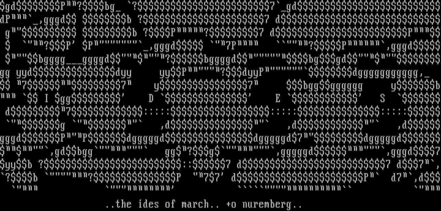 77 y7 bgggggggg yb I gg D E S d7::::::::::::::: g ,d ,d ,dgggdPPdgggggddgggggd7dgggggd,gdbgg gg?g,gggggd,gggd7yyb ?::7 d7 d7,?b ?P 77 dP d7,d ..the ides of march.. +o nuremberg..