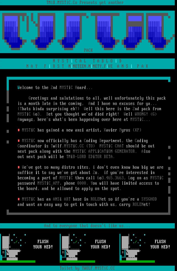 MYSTiC has an ANSi ART base in ROLENet so if youre a SYSGHOD