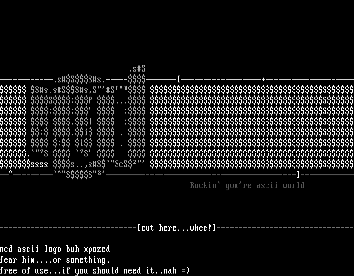 ------.sSSs.-----------+------ Ss.sSSs,SS S:P ... : : . : .i . : i . .S S ssss s..,sSScS ----SS------------ Rockin youre ascii world