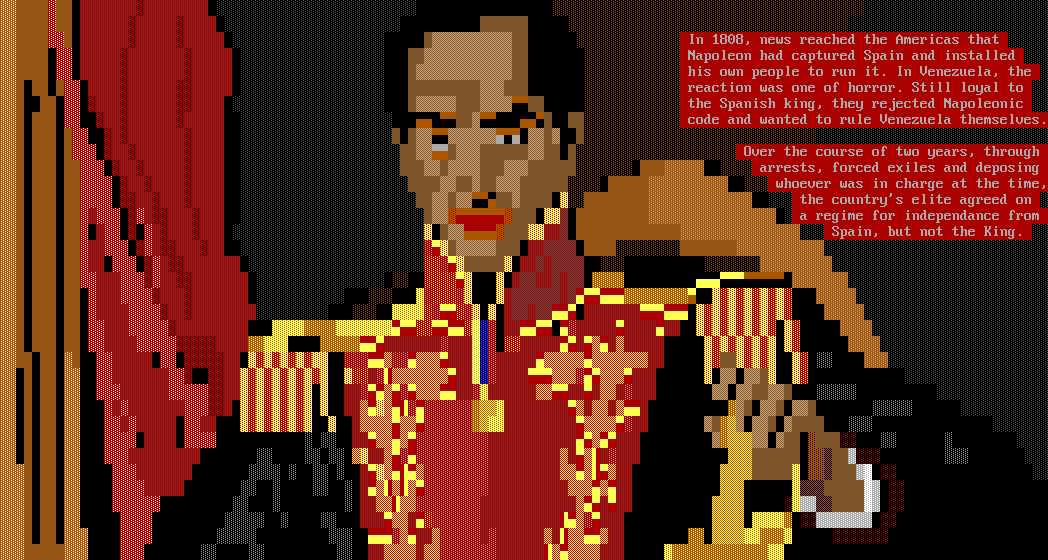 In 1808, news reached the Americas that Napoleon had captured Spain and installed his own people to run it. In Venezuela, the reaction was one of horror. Still loyal to the Spanish king, they rejected Napoleonic code and wanted to rule Venezuela themselves. Over the course of two years, through arrests, forced exiles and deposing whoever was in charge at the time, the countrys elite agreed on a regime for independance from Spain, but not the King.
