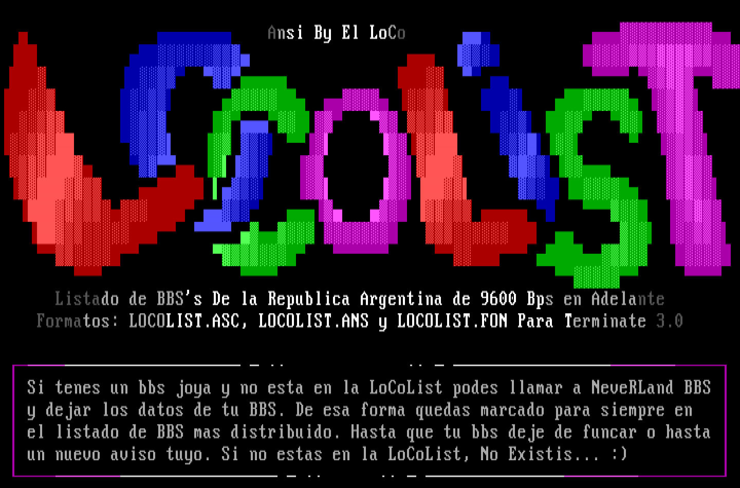 Si tenes un bbs joya y no esta en la LoCoList podes llamar a NeveRLand BBS