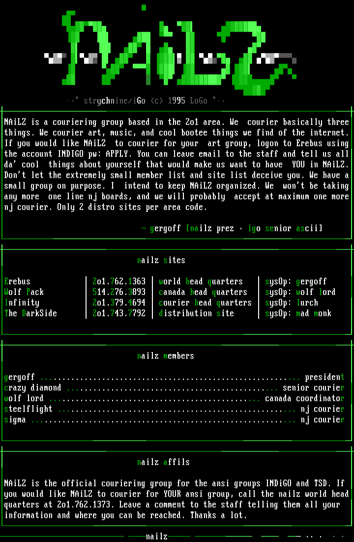 NAiLZ is a couriering group based in the 2o1 area. We courier basically threethings. We courier art, music, and cool bootee things we find of the internet.If you would like NAiLZ to courier for your art group, logon to Erebus usingthe account INDIGO pw: APPLY. You can leave email to the staff and tell us allda cool things about yourself that would make us want to have YOU in NAiLZ.Dont let the extremely small member list and site list deceive you. We have asmall group on purpose. I intend to keep NAiLZ organized. We wont be takingany more one line nj boards, and we will probably accept at maximum one morenj courier. Only 2 distro sites per area code. gergoff nailz prez igo senior ascii nailz sites Erebus 2o1.762.1363 world head quarters sysOp: gergoff Wolf Pack 514.276.3893 canada head quarters sysOp: wolf lord Infinity 2o1.379.4694 courier head quarters sysOp: lurch The DarkSide 2o1.743.7792 distribution site sysOp: mad monk nailz members gergoff ........................................................... president crazy diamond ................................................ senior courier wolf lord ................................................ canada coordinator steelflight ...................................................... nj courier sigma ............................................................ nj courier nailz affils NAiLZ is the official couriering group for the ansi groups INDiGO and TSD. If you would like NAiLZ to courier for YOUR ansi group, call the nailz world headquarters at 2o1.762.1373. Leave a comment to the staff telling them all your information and where you can be reached. Thanks a lot. nailz