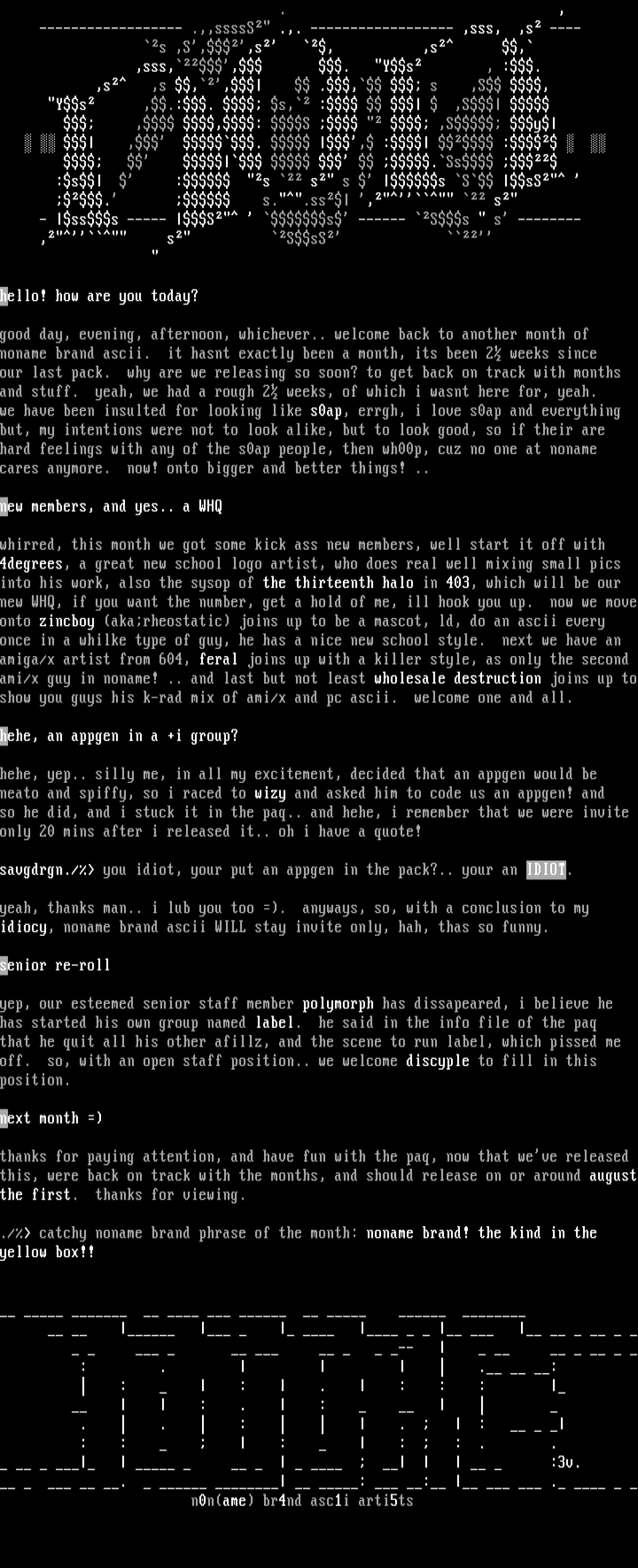 noname brand ascii. it hasnt exactly been a month, its been 2 w