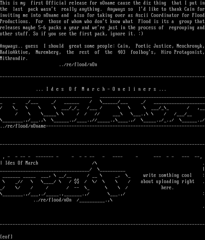This is my first Official release for nOname cause the diz thing that I put inthe last pack wasnt really anything. Anyways so Id like to thank Cain forinviting me into nOname and also for taking over as Ascii Coordinator for FloodProductions. For those of whom who dont know what Flood is its a group thatreleases maybe 5-6 packs a year and were just in the process of regrouping andother stuff. So if you see the first pack, ignore it. :