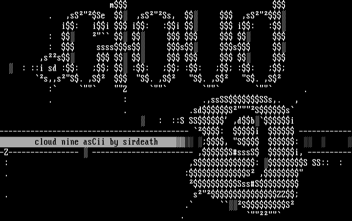 ------------------------------------------- : i ------------ cloud nine asCii by sirdeath , S : -Z---------------- ----------------------- ,SsssS i, ---------- : ,S: S SS:: :