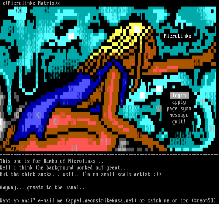 Want an ansi? e-mail me appel.neonstrike@usa.net or catch me on irc neon98