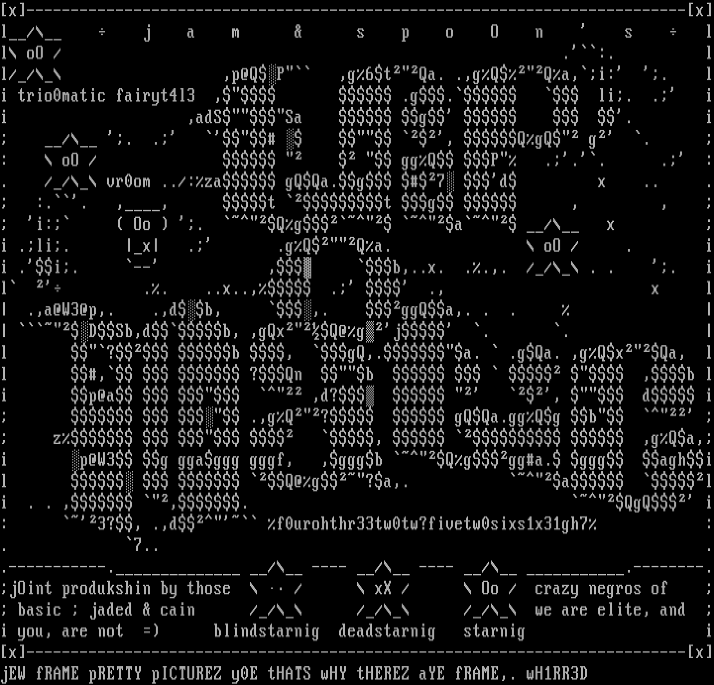 x--------------------------------------------------------------------------xl/ j a m s p o O n s ll oO / .:. ll// ,p@QP ,g6tQa. .,gQQa,i: . li trio0matic fairyt4l3 , .g. li. . ii ,adSSa g . i / . . , QgQ g . : oO / ggQ P ... . :. // vr0om ../:za gQQa.g 7 d x .. . :.. ,, t t g , , i: Oo . Qg a / x i .li. x . .gQQa. oO / . ii .i. -- , b,..x. ..,. // . . . il .. ..x.., . ., x l .,a@W3@p,. .,db, ,. ggQa,. . . DSb,db, ,gQxQ@gj . . l ? b , gQ,.a. .gQa. ,gQxQa, ll , ?Qn b ,b li p@a ,d? , d i .,gQ? gQQa.ggQg b z , ,gQa,i p@W3 g ggaggg gggf, ,gggb Qggga. ggg aghil Q@g?a,. a li . . , ,. QgQ i: 3?, .,d f0urohthr33tw0tw?fivetw0sixs1x31gh7 :. 7.. ..-----------. / ---- / ---- / .--------.jOint produkshin by those / xX / Oo / crazy negros of basic jaded cain // // // we are elite, and i you, are not blindstarnig deadstarnig starnig ix--------------------------------------------------------------------------xjEW fRAME pRETTY pICTUREZ y0E tHATS wHY tHEREZ aYE fRAME,. wH1RR3D