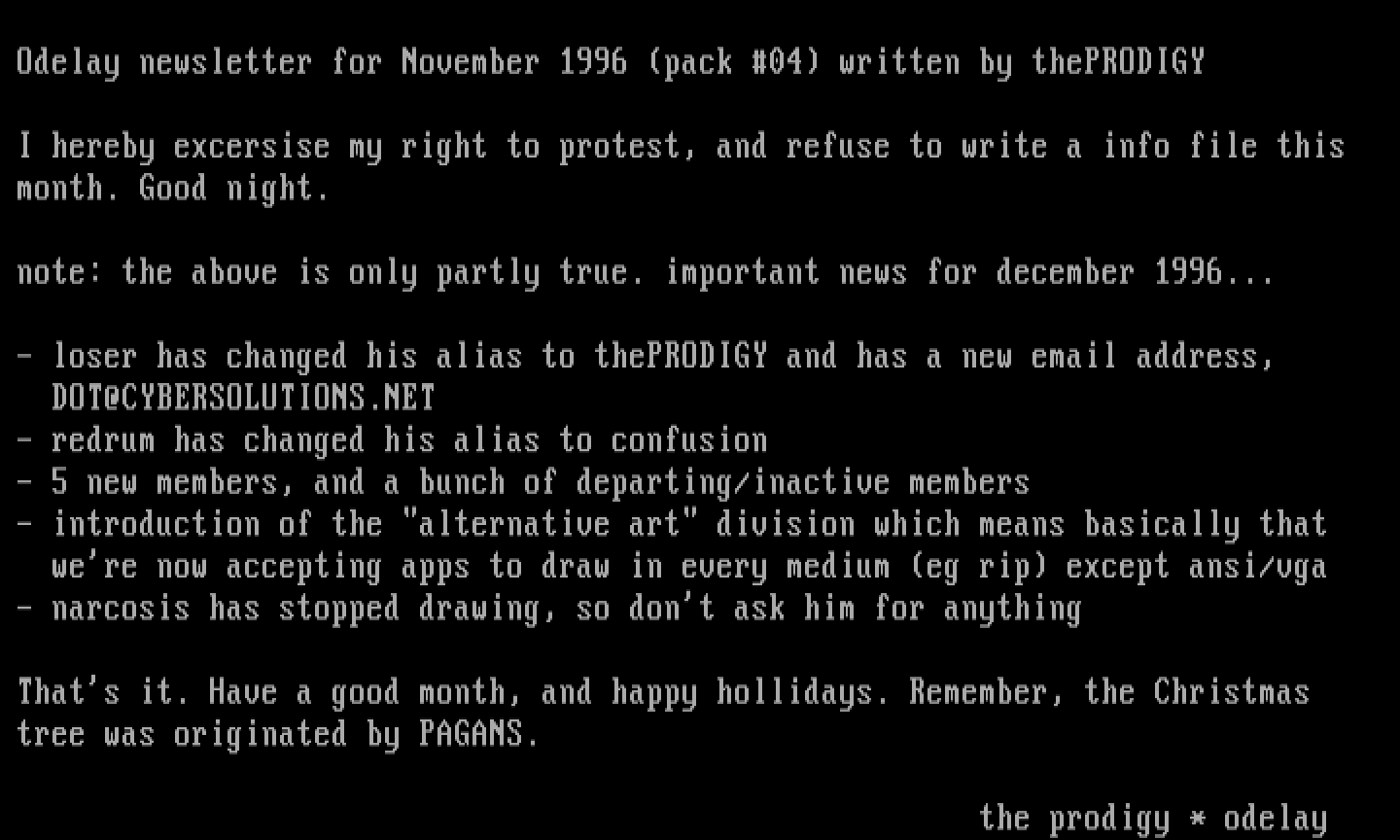 Odelay newsletter for November 1996 pack 04 written by thePRODIGY