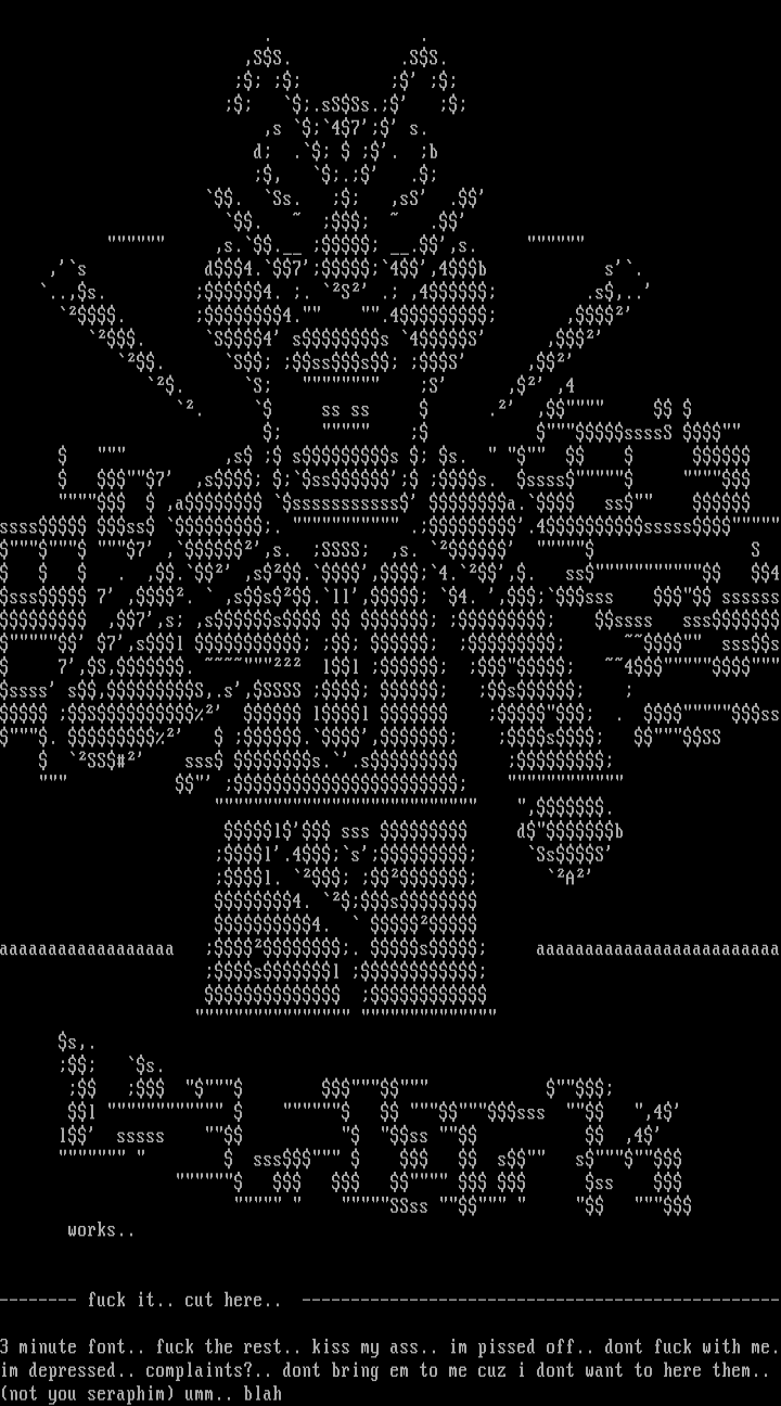 3 minute font.. fuck the rest.. kiss my ass.. im pissed off.. dont fuck with me.im depressed.. complaints?.. dont bring em to me cuz i dont want to here them..