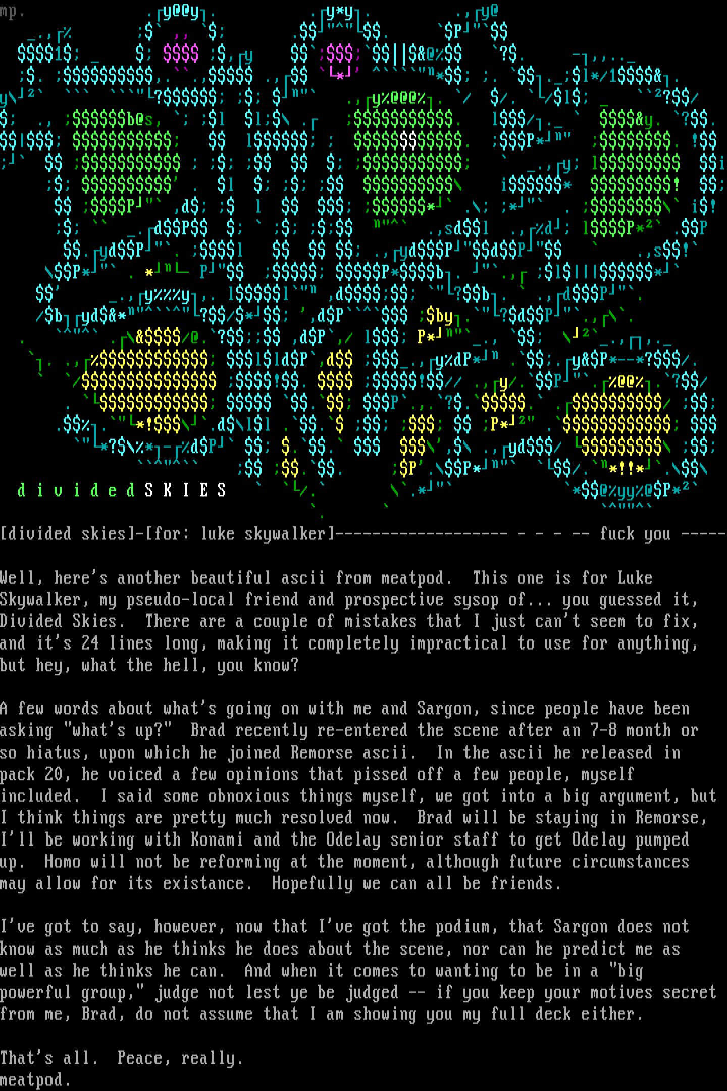 Well, heres another beautiful ascii from meatpod. This one is for Luke