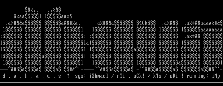.aa aa. .aa 4Ck .a .aaaaa l l l l laaaaaaaa: : : .a l lal l l l l a : a : : l l l l a l-aa a --aa -aa a- d . a . h . a . u . s ! sys: iShmael / rTi . aCk! / kTs / oDi ! running: iMp