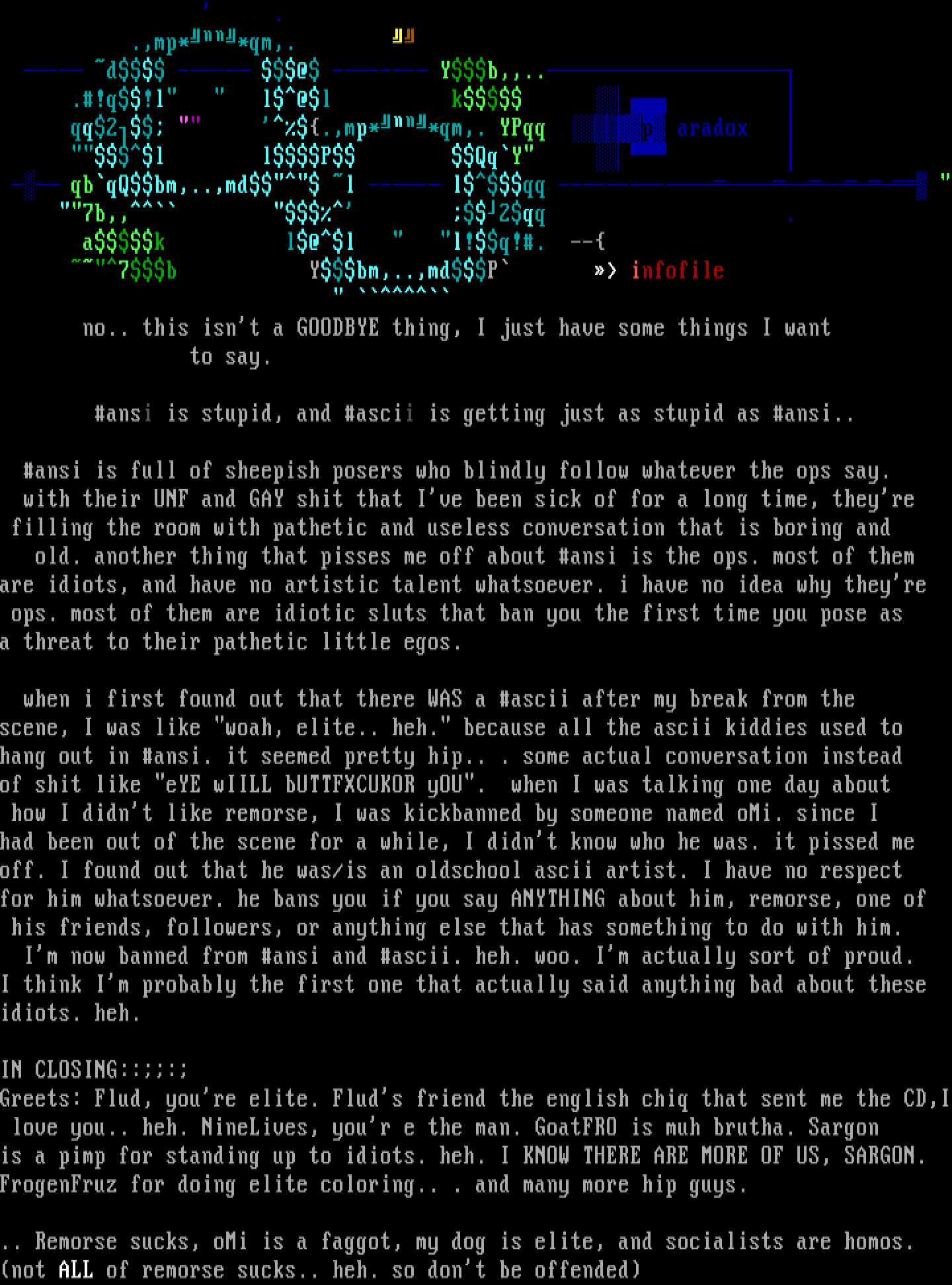 Im now banned from ansi and ascii. heh. woo. Im actual