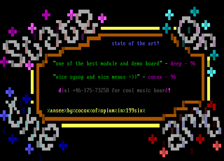 nice sysop and nice menus - cocox - 96 dial +46-175-73258 for cool music board!