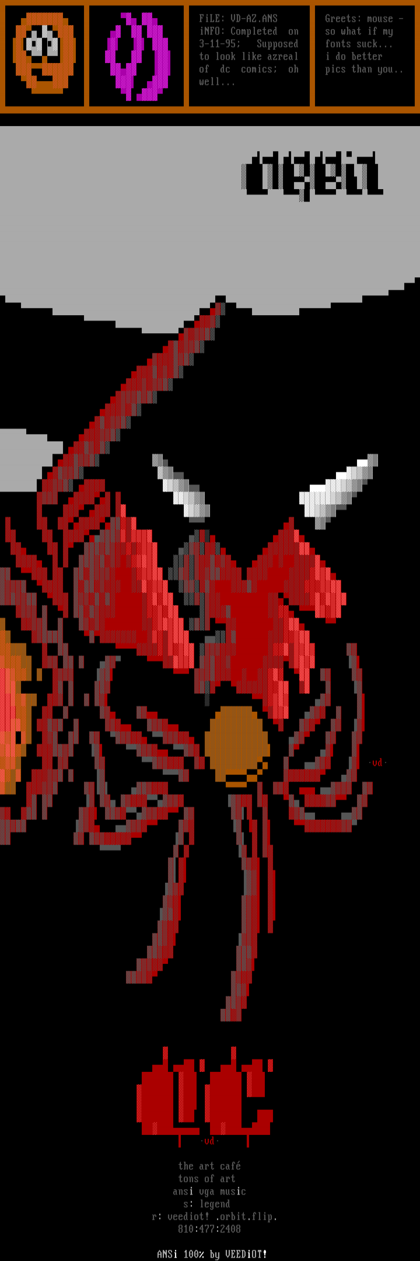 FiLE: VD-AZ.ANS Greets: mouse - iNFO: Completed on so what if my 3-11-95 Supposed fonts suck... to look like azreal i do better of dc comics oh pics than you.. well...