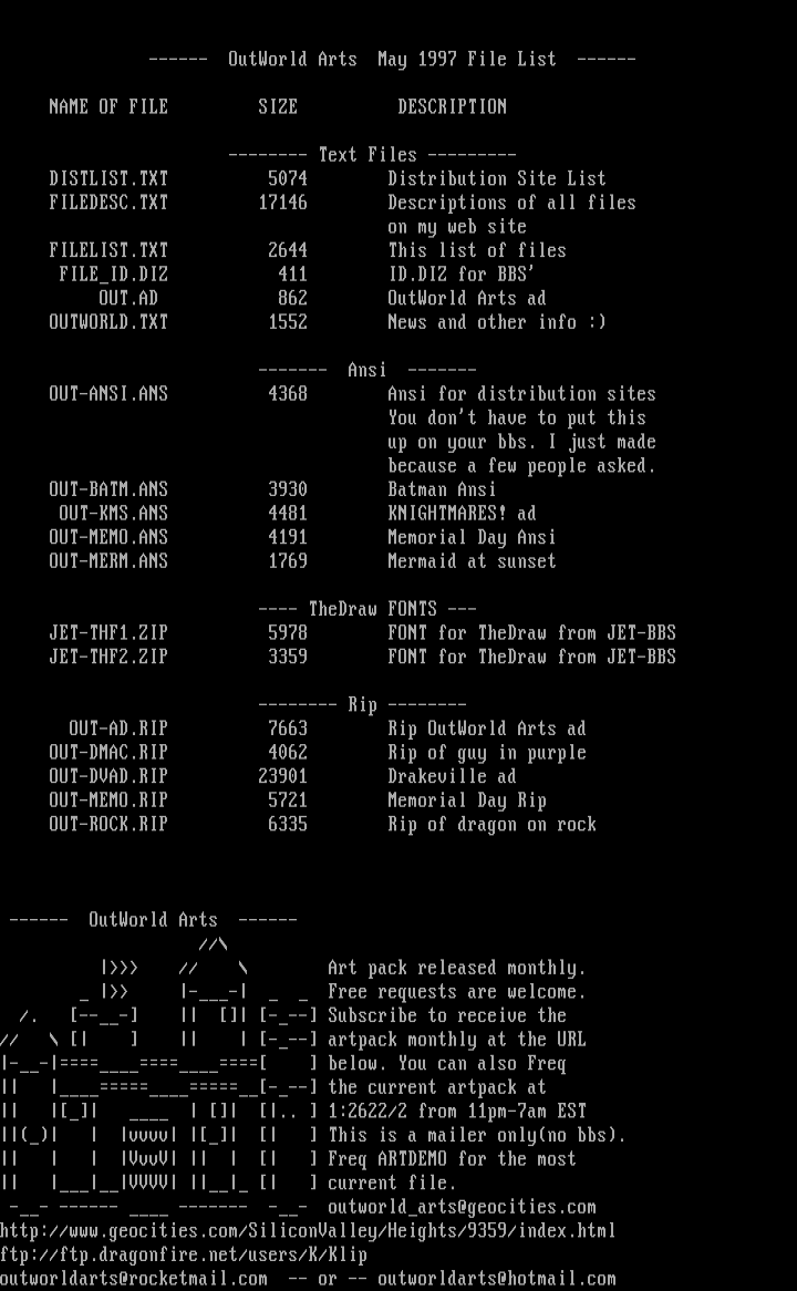 outworldarts@rocketmail.com -- or -- outworldarts@hotmail.com
