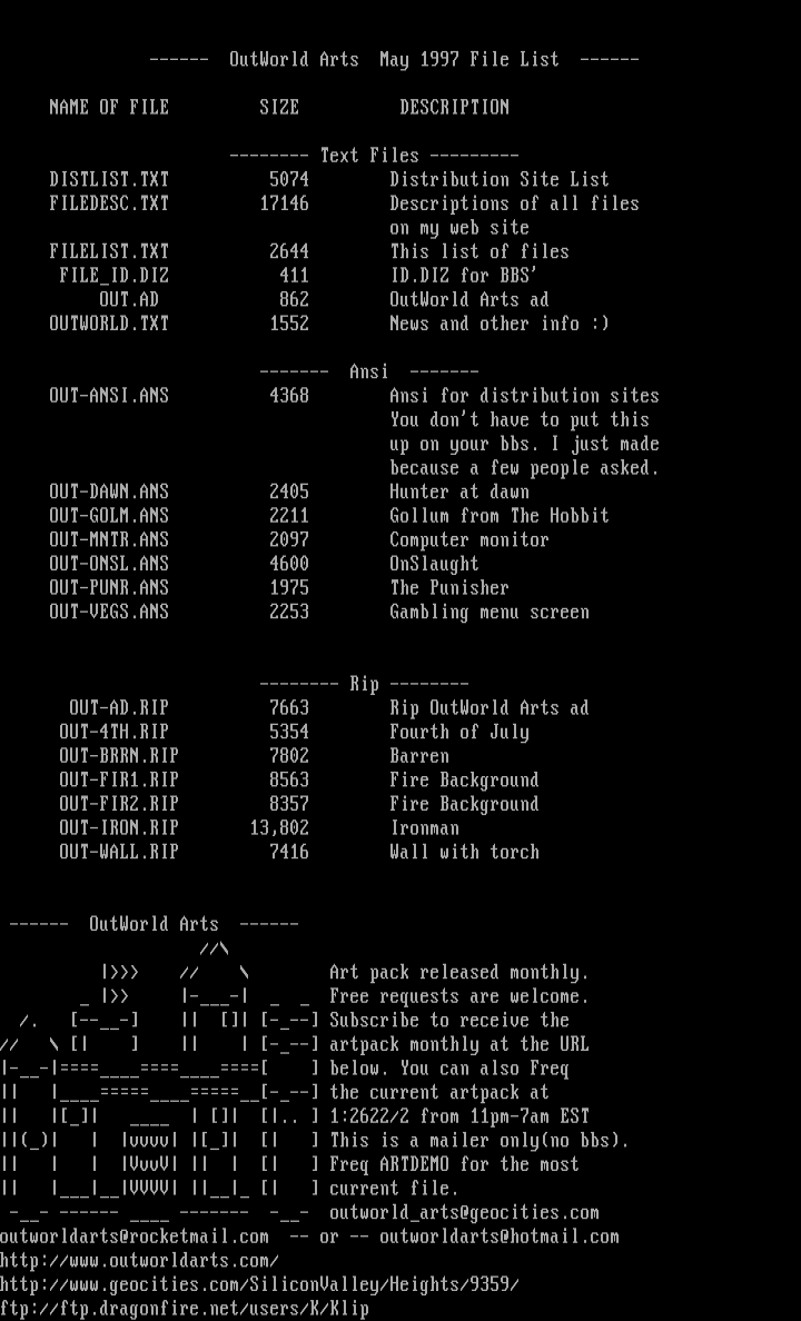 outworldarts@rocketmail.com -- or -- outworldarts@hotmail.com