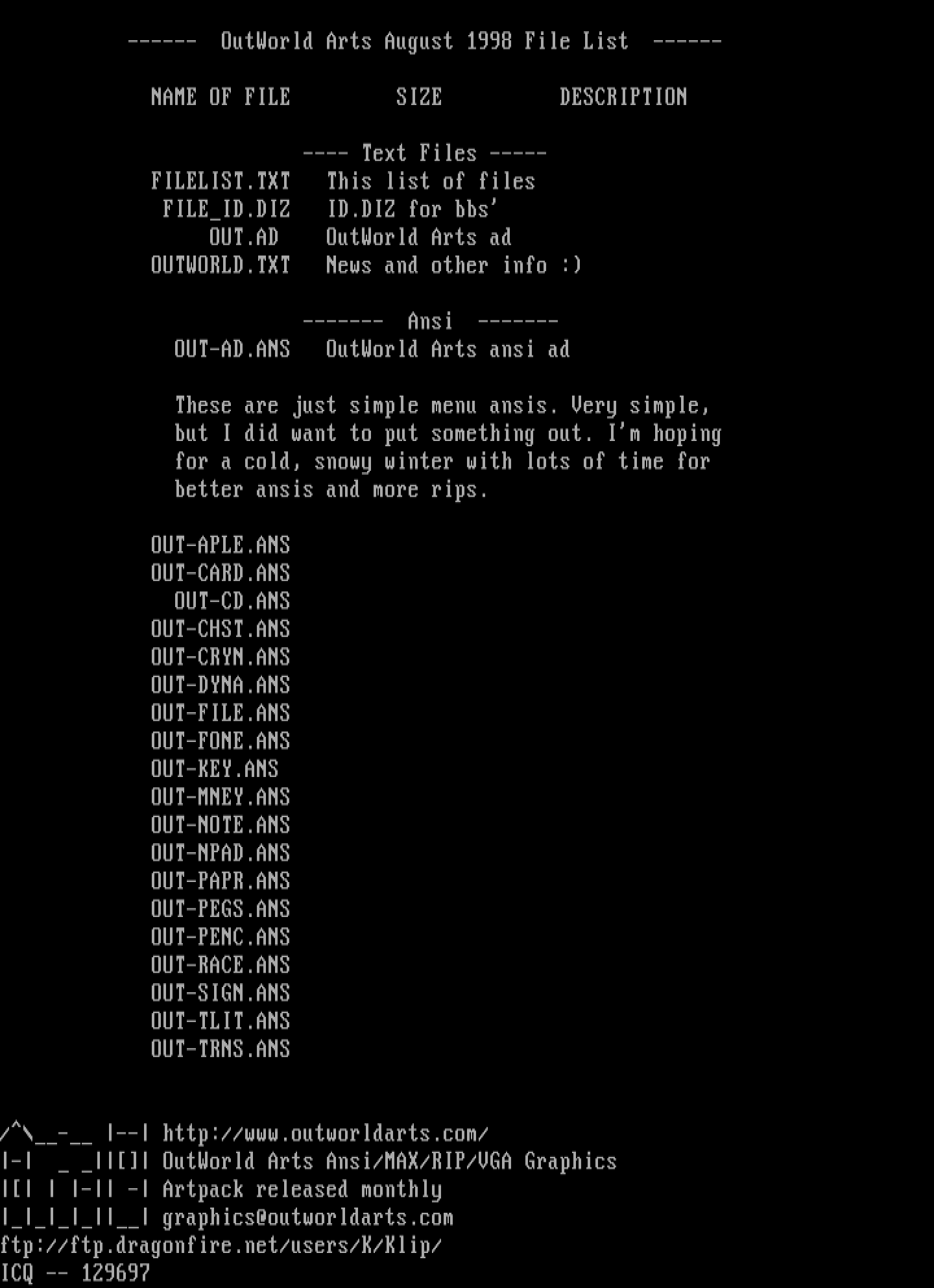 - OutWorld Arts Ansi/MAX/RIP/VGA Graphics