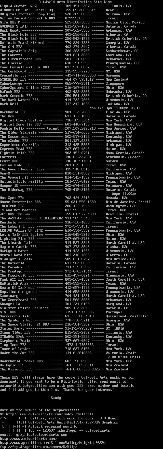 outworldarts@geocities.com with your BBS name, number and location