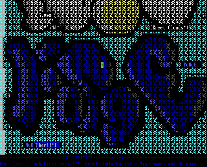 , .,,,, ,, , . 4 ,, ,, Md! ,,,Ereet Clouds!,,, ,, . , . ,, ,, ,, @, ,, , , , , FoRgE. , . ., ,. ,, , . , , ., , ,, , ,, , , ,, , , , , , , , 4 ,, , , ,, , ., ,, ,, ,, ,, ,, , MuDPhar!!!! , ,------------------------SiP!!!!!!!-----++++++--------------------------------Wow. This is mah First Ascii!!!. Greets outa Sadistic Nightmare, and Shaggie...