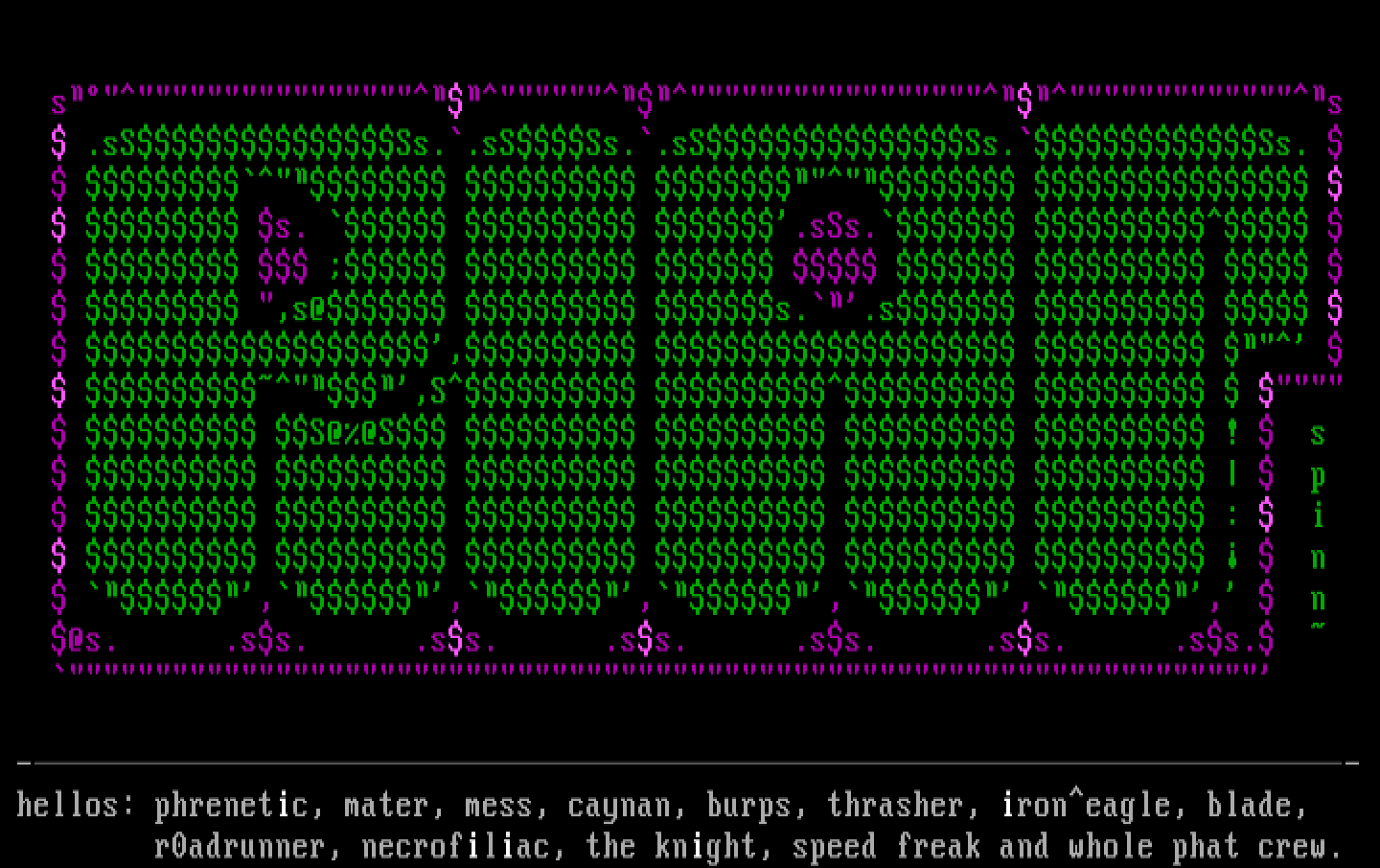 hellos: phrenetic, mater, mess, caynan, burps, thrasher, ironeagle, blade,