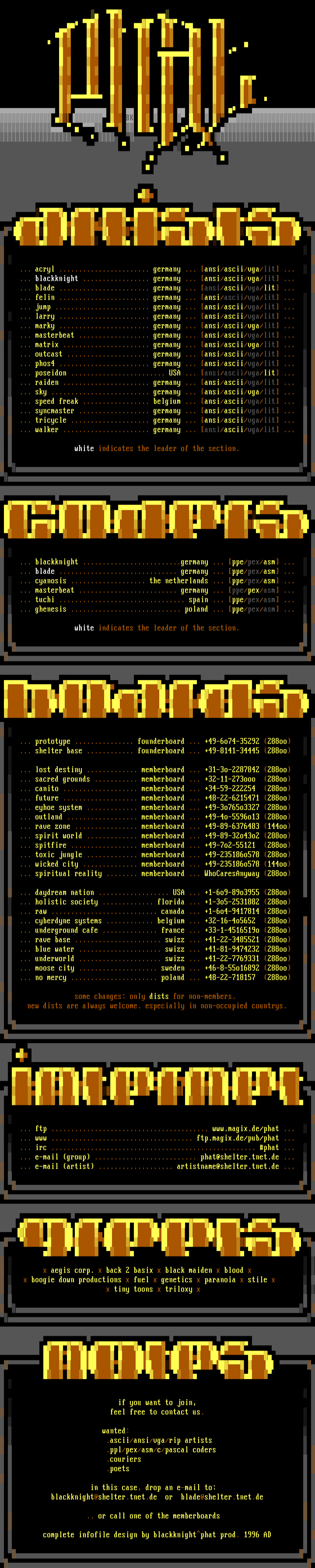 ... ftp ........................................ www.magix.de/phat ... ... www .................................... ftp.magix.de/pub/phat ... ... irc .................................................... phat ... ... e-mail group .......................... phat@shelter.tnet.de ... ... e-mail artist ................... artistname@shelter.tnet.de ...