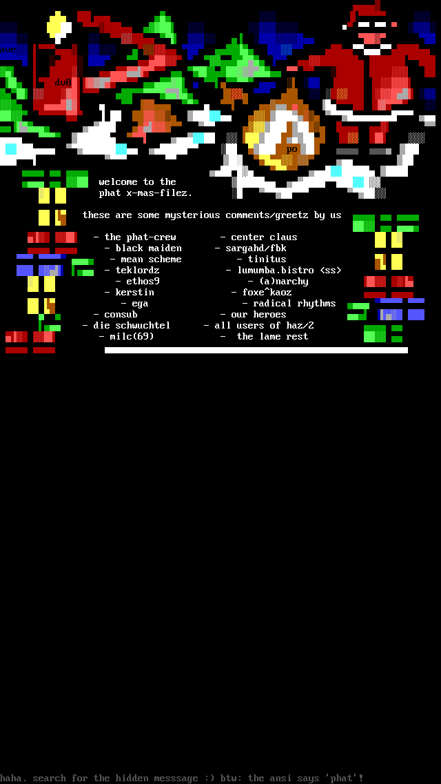haha. search for the hidden messsage : btw: the ansi says phat!