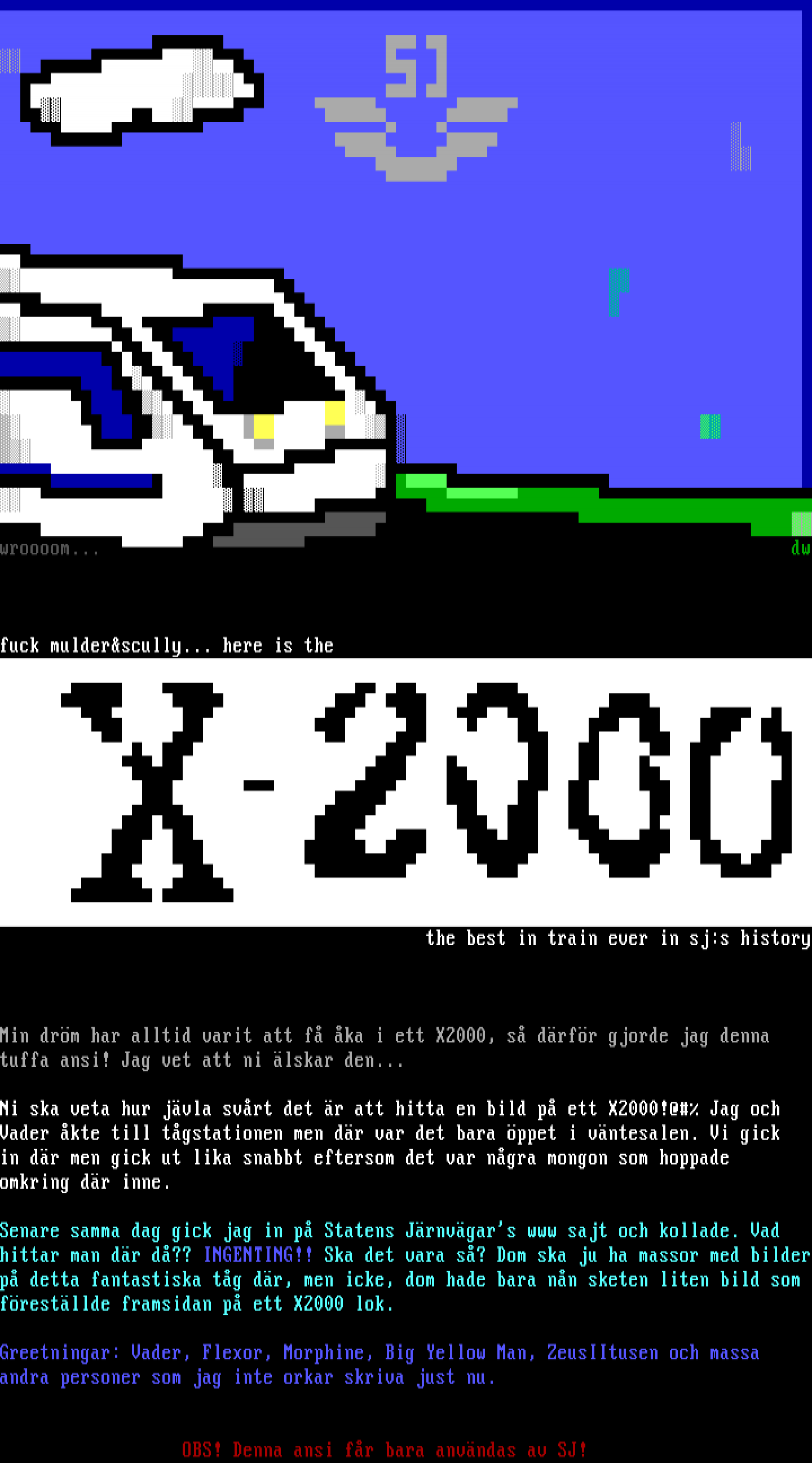 Min drm har alltid varit att f ka i ett X2000, s drfr gjorde jag denna tuffa ansi! Jag vet att ni lskar den... Ni ska veta hur jvla svrt det r att hitta en bild p ett X2000!@ Jag och Vader kte till tgstationen men dr var det bara ppet i vntesalen. Vi gick in dr men gick ut lika snabbt eftersom det var ngra mongon som hoppade omkring dr inne. Senare samma dag gick jag in p Statens Jrnvgars www sajt och kollade. Vad hittar man dr d?? INGENTING!! Ska det vara s? Dom ska ju ha massor med bilderp detta fantastiska tg dr, men icke, dom hade bara nn sketen liten bild som frestllde framsidan p ett X2000 lok. Greetningar: Vader, Flexor, Morphine, Big Yellow Man, ZeusIItusen och massa