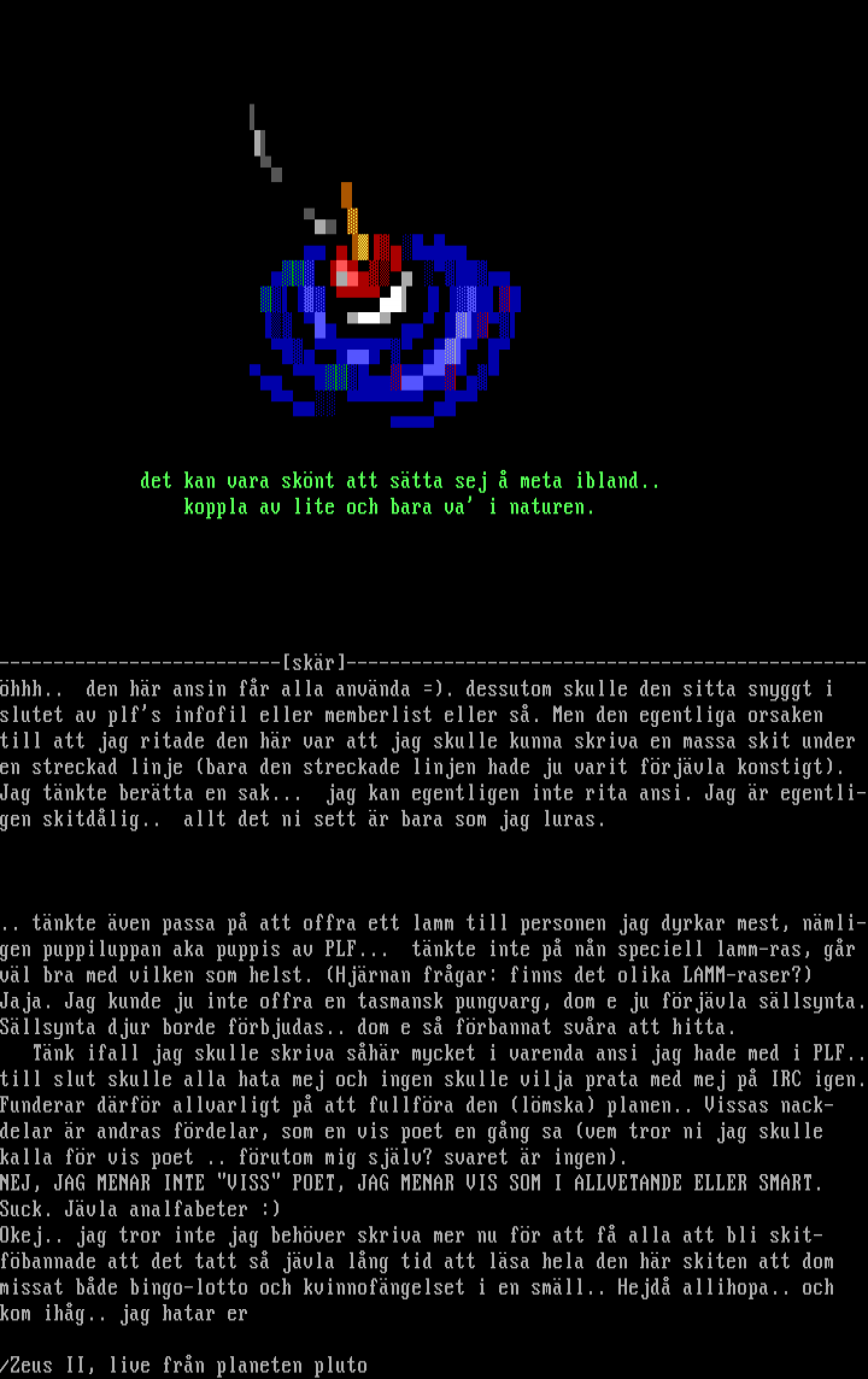 Tnk ifall jag skulle skriva shr mycket i varenda ansi jag hade med i PLF..till slut skulle alla hata mej och ingen skulle vilja prata med mej p IRC igen.Funderar drfr allvarligt p att fullfra den lmska planen.. Vissas nack-