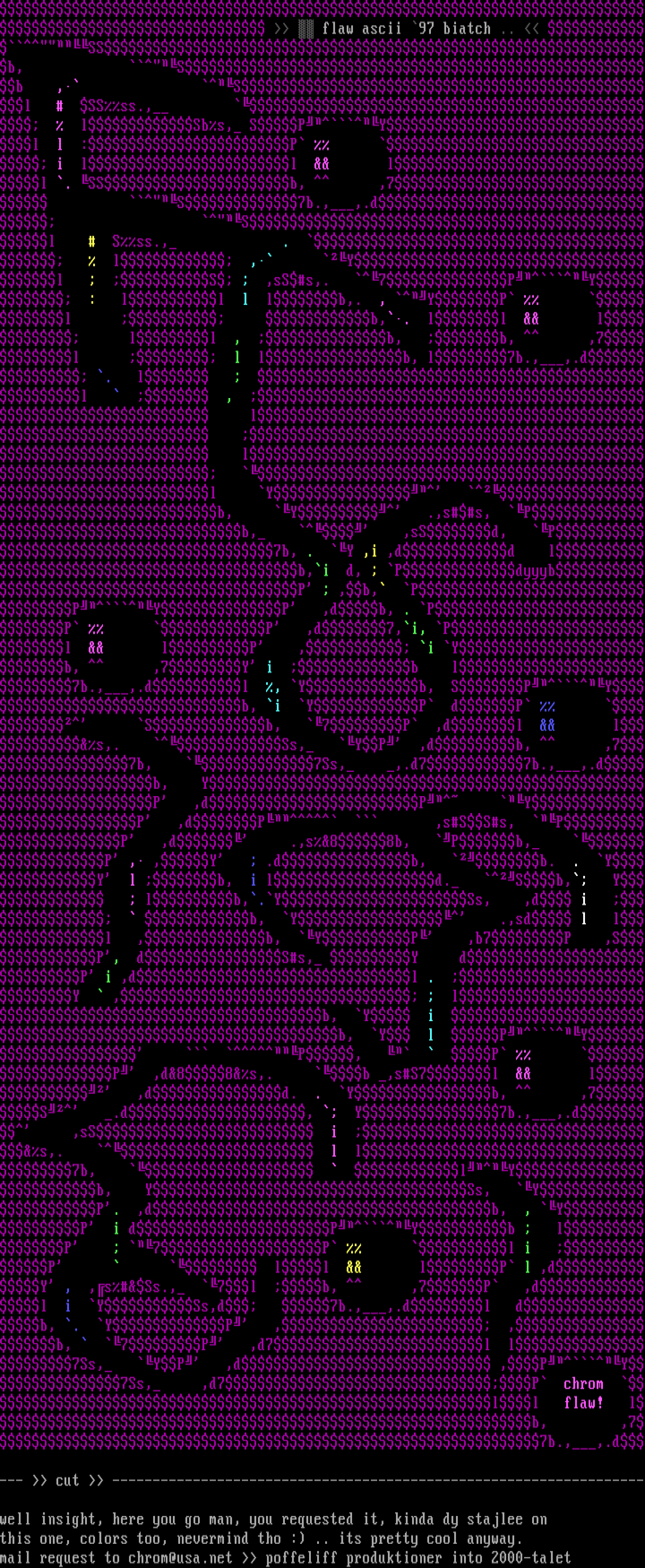flaw ascii 97 biatch .. SSb, Sb , Sl SSss., lSbs, SPYl l :P i ll ll . SSb, ,7 S7b.,,.d Sl Sss., . l , Yl S ,sSs,. 7PY : ll l lb,. , YP l b,. ll l ll , b, b, ,7l l lb, l7b.,,.d . l l , l l l Y b, Y .,ss, Pb, ,sSd, P7b, . Y ,i ,dd lb,i d, PdyyybP ,b, PPYP ,db, . PP P ,d7,i, Pl lP , i Yb, ,7Y i b l7b.,,.dl , Yb, SPYb, i YP dP Sb, 7P ,dl ls,. Ss, YP ,db, ,77b, 7Ss, ,.d77b.,,.db, YP ,dP YP ,dP ,sSSs, PP ,d .,s88b, Pb, P , ,Y .db, b. . YY l b, i ld. Sb, Y lb,.YSs, ,d i b, Y .,sd l ll ,b, YP ,b7P ,SP, dSs, Y dP i ,dl . Y , lb, Y i b, Y l PY P, P P ,d88s,. b ,sS7l l ,dd. . Yb, ,7S .d, Y7b.,,.d ,sS i s,. l l7b, lYb, YSs, YP. ,db, , YP i dPYb lP 7P l i P ll lP l ,dY , ,sSs., 7l b, ,7P ,dl i YSs,d 7b.,,.dl db, . YP , ,b, 7P ,d7l l7Ss, YP ,d ,PY7Ss, ,d7P chrom ll flaw! lb, ,77b.,,.d