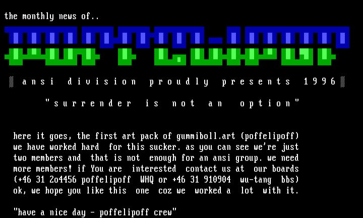 +46 31 2o4456 poffelipoff WHQ or +46 31 910904 wu-tang bbs