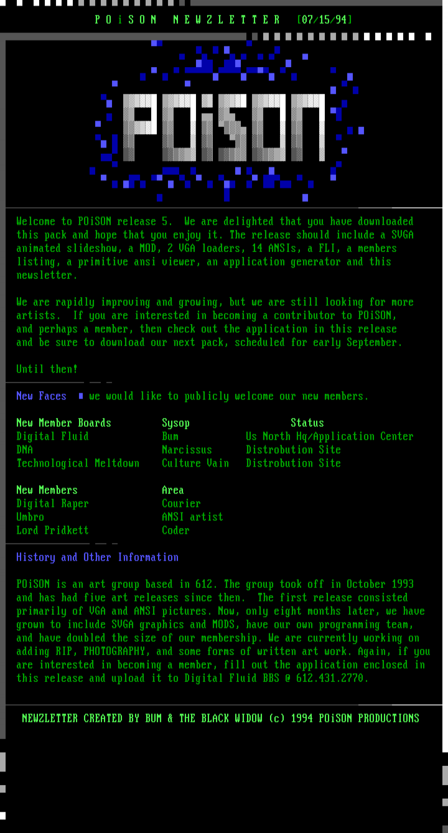 P O i S O N N E W Z L E T T E R 07/15/94 Welcome to POiSON release 5. We are delighted that you have downloaded this pack and hope that you enjoy it. The release should include a SVGA animated slideshow, a MOD, 2 VGA loaders, 14 ANSIs, a FLI, a members listing, a primitive ansi viewer, an application generator and this newsletter. We are rapidly improving and growing, but we are still looking for more artists. If you are interested in becoming a contributor to POiSON, and perhaps a member, then check out the application in this release and be sure to download our next pack, scheduled for early September. Until then! New Faces we would like to publicly welcome our new members. New Member Boards Sysop Status Digital Fluid Bum Us North Hq/Application Center DNA Narcissus Distrobution Site Technological Meltdown Culture Vain Distrobution Site New Members Area Digital Raper Courier Umbro ANSI artist Lord Pridkett Coder History and Other Information POiSON is an art group based in 612. The group took off in October 1993 and has had five art releases since then. The first release consisted primarily of VGA and ANSI pictures. Now, only eight months later, we have grown to include SVGA graphics and MODS, have our own programming team, and have doubled the size of our membership. We are currently working on adding RIP, PHOTOGRAPHY, and some forms of written art work. Again, if you are interested in becoming a member, fill out the application enclosed in this release and upload it to Digital Fluid BBS @ 612.431.2770. NEWZLETTER CREATED BY BUM THE BLACK WIDOW c 1994 POiSON PRODUCTIONS