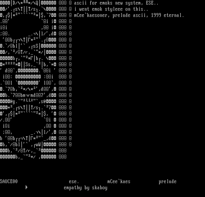 D/**/Q ascii for emoks new system, ESE.. /.sTT/s. i went emok styleee on this.. ,**,7 mCeekaesoner, prelude ascii, 1999 eternal. . i i ii , i . .l/,d bT*. ./bl ,sS /,/T/,*/ b,*b. **Ss,b,* d,.i i: :i .l l, .7b,*/*,d, b.7bmmd7,d @g.,s@ *.sTT/s.7 ,**, /. i ii , , .l/, b bT*,d b,/bl ,wW b,/T/, b,*/ , SAUCE00 ese. mCeekaes prelude empathy by skaboy
