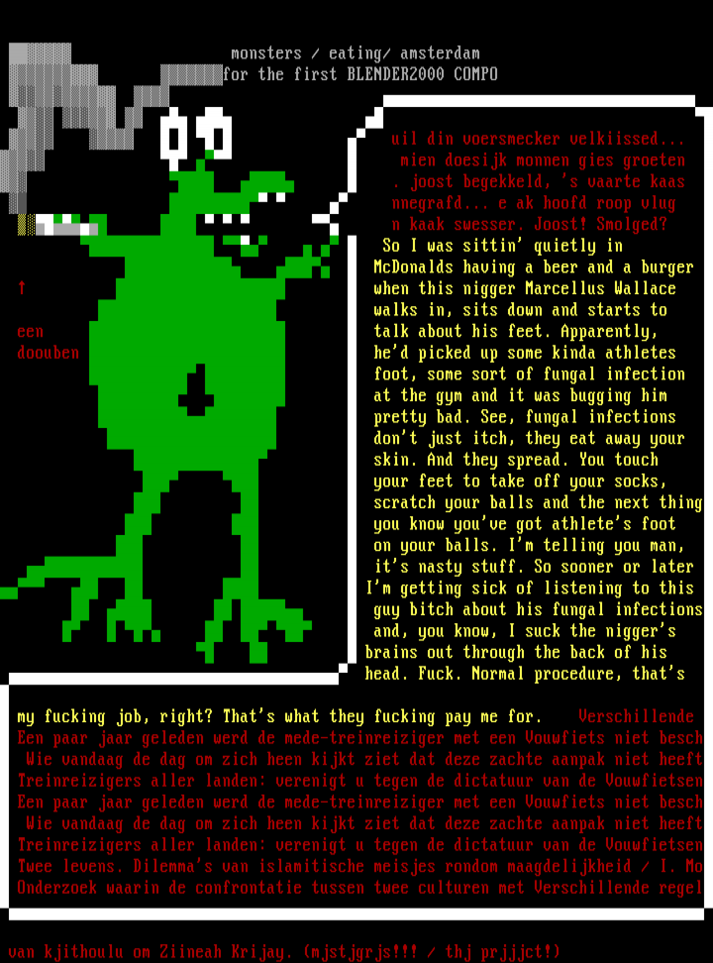 uil din voersmecker velkiissed... mien doesijk monnen gies groeten . joost begekkeld, s vaarte kaas nnegrafd... e ak hoofd roop vlug n kaak swesser. Joost! Smolged? So I was sittin quietly in McDonalds having a beer and a burger when this nigger Marcellus Wallace walks in, sits down and starts to een talk about his feet. Apparently, doouben hed picked up some kinda athletes foot, some sort of fungal infection at the gym and it was bugging him pretty bad. See, fungal infections dont just itch, they eat away your skin. And they spread. You touch your feet to take off your socks, scratch your balls and the next thing you know youve got athletes foot on your balls. Im telling you man, its nasty stuff. So sooner or later Im getting sick of listening to this guy bitch about his fungal infections and, you know, I suck the niggers brains out through the back of his head. Fuck. Normal procedure, thats my fucking job, right? Thats what they fucking pay me for. Verschillende Een paar jaar geleden werd de mede-treinreiziger met een Vouwfiets niet besch Wie vandaag de dag om zich heen kijkt ziet dat deze zachte aanpak niet heeft Treinreizigers aller landen: verenigt u tegen de dictatuur van de Vouwfietsen Een paar jaar geleden werd de mede-treinreiziger met een Vouwfiets niet besch Wie vandaag de dag om zich heen kijkt ziet dat deze zachte aanpak niet heeft Treinreizigers aller landen: verenigt u tegen de dictatuur van de Vouwfietsen Twee levens. Dilemmas van islamitische meisjes rondom maagdelijkheid / I. Mo Onderzoek waarin de confrontatie tussen twee culturen met Verschillende regel