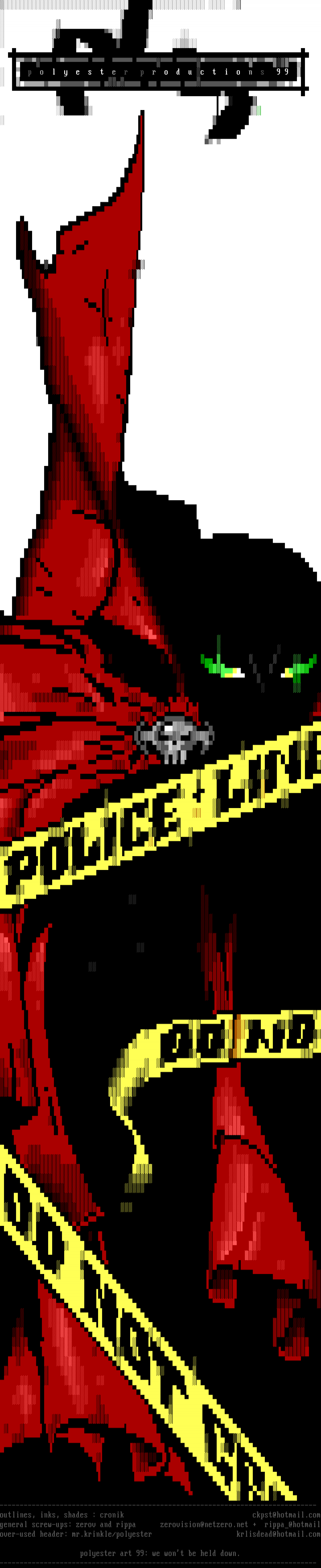 ------------------------------------------------------------------------------- outlines, inks, shades : cronik ckpst@hotmail.comgeneral screw-ups: zerov and rippa zerovision@netzero.net + rippa@hotmailover-used header: mr.krinkle/polyester krlisdead@hotmail.com