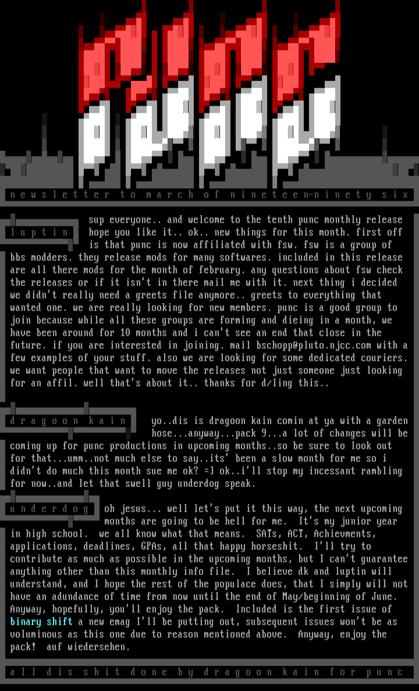 n e w s l e t t e r t o m a r c h o f n i n e t e e n-n i n e t y s i x sup everyone.. and welcome to the tenth punc monthly release l u p t i n hope you like it.. ok.. new things for this month. first off is that punc is now affiliated with fsw. fsw is a group of bbs modders. they release mods for many softwares. included in this release are all there mods for the month of february. any questions about fsw check the releases or if it isnt in there mail me with it. next thing i decided we didnt really need a greets file anymore.. greets to everything that wanted one. we are really looking for new members. punc is a good group to join because while all these groups are forming and dieing in a month, we have been around for 10 months and i cant see an end that close in the future. if you are interested in joining. mail bschopp@pluto.njcc.com with a few examples of your stuff. also we are looking for some dedicated couriers. we want people that want to move the releases not just someone just looking for an affil. well thats about it.. thanks for d/ling this.. d r a g o o n k a i n yo..dis is dragoon kain comin at ya with a garden hose...anyway...pack 9...a lot of changes will be coming up for punc productions in upcoming months..so be sure to look out for that...umm..not much else to say..its been a slow month for me so i didnt do much this month sue me ok? ok..ill stop my incessant rambling for now..and let that swell guy underdog speak. u n d e r d o g oh jesus... well lets put it this way, the next upcoming months are going to be hell for me. Its my junior year in high school. we all know what that means. SATs, ACT, Achievments, applications, deadlines, GPAs, all that happy horseshit. Ill try to contribute as much as possible in the upcoming months, but I cant guarantee anything other than this monthly info file. I believe dk and luptin will understand, and I hope the rest of the populace does, that I simply will not have an adundance of time from now until the end of May/beginning of June. Anyway, hopefully, youll enjoy the pack. Included is the first issue of binary shift a new emag Ill be putting out, subsequent issues wont be as voluminous as this one due to reason mentioned above. Anyway, enjoy the pack! auf wiedersehen. a l l d i s s h i t d o n e b y d r a g o o n k a i n f o r p u n c
