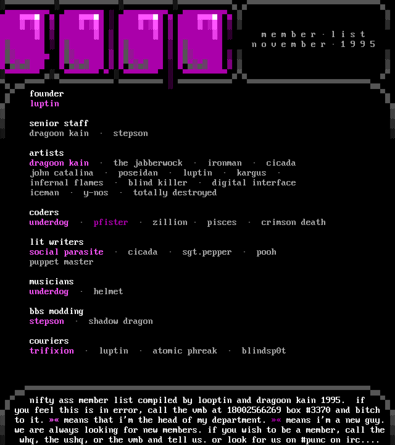 nifty ass member list compiled by looptin and dragoon kain 1995. if