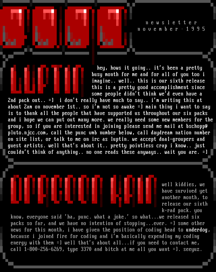 group, so if you are interested in joining please send me mail at bschopp@ pluto.njcc.com, call the punc vmb number below, call daydream nation number on site list, or talk to me on irc as luptin. we accept dual-groupers and guest artists. well thats about it.. pretty pointless crap i know.. just couldnt think of anything.. no one reads these anyways.. wait you are.