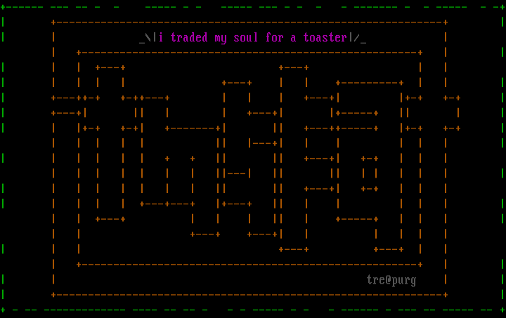 +-----------------------------------------------------+ tre@purg +-------------------------------------------------------------+ + - -- ------------- ---- -- -- - - - ----- - - - ------ - --- -- ----- -- +