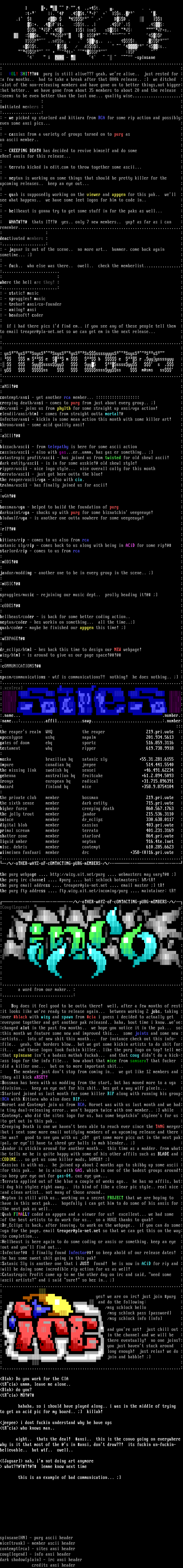 ................................................................................: :: HOLY SHIT!?@ purg is still alive??? yeah, were alive.. just rested for ::a few months.. had to take a break after that 800k release.. we ditched ::alot of the non-releasing members and have gone on to better things,not bigger::but better.. we have gone from about 35 members to about 20 and the release ::seems to be even better than the last one... quality wise.....................:: : :initiated members : ::.................: :: - we picked up starlord and kitiara from RCA for some rip action and possibly:even some ansi pics... :: :: - cassius from a variety of groups turned on to purg as :an ascii member.. :: :: - CREEPING DEATH has decided to revive himself and do some :eReeT ansis for this release... :: :: - terrato kicked in edit.com to throw together some ascii... :: :: - neptun is working on some things that should be pretty killer for the :upcoming releases.. keep an eye out... :: :: - quab is supposedly working on the viewer and appgen for this pak.. well :see what happens.. we have some leet logos for him to code in.. :: :: - hellbeast is gonna try to get some stuff in for the paks as well... :: :: WHAT?!@ thats IT!?@ yes.. only 7 new members.. yup! as far as i can :remember.......................................................................:: : :deactivated members : ::...................: :: - jaguar is out of the scene.. no more art.. bummer. come back again :sometime... :: :: - fuck.. who else was there.. owell.. check the memberlist................::......................... :: : :where the hell are they! : ::........................: :: - static! music :: - spraggles! music :: - trebor! ansi/co-founder :: - anilog! ansi :: - headsoft! coder :: :: if i had there pics id find em.. if you see any of these people tell them :to email treaper@pla-net.net so we can get em in the next release... :: ::..............................................................................:: :: ysSysSSsysSSsysSysSSsssssyyysSSsysSSsS :: m e m b e r ,yyyssssyyy :: yyssssyy yy ssssyy s , :: y ss ssssyyss m@sms ss ::..............................................................................:: ::aNSI!@ :: :contempt/ansi - yet another rca member... ::::::::::::::::::: :creeping death/ansi - comes to purg from just about every group.. :drc/ansi - joins us from phylth for some straight up ansi/vga action! :elendil/ansi/html - comes from straight outta mortal!@ :infector/ansi - kickin in some mean action this month with some killer art! :khrono/ansi - some acid quality ansi! :: ::aSCII!@ :: :bizzach/ascii - from telepathy is here for some ascii action :cassius/ascii - also with gas...er..ummm, has gas er something.. :catastropic profit/ascii - has joined us from twisted for old skewl ascii! :dark entity/ascii - is in for some asskie!@ old skewl style! :ripper/ascii - nice logo style... nice overall colly for this month :terrato/ascii - just got here outta the blue! :the reaper/ascii/vga - also with cia. :trahma/ascii - has finally joined us for ascii! :: ::vGA!@ :: :bossman/vga - helped to build the foundation of purg :darksaint/vga - shacks up with purg for some biznatchin veegeeaye! :bludwulf/vga - is another one outta nowhere for some veegeeaya! :: ::rIP!@ :: :kitiara/rip - comes to us also from rca :satanic sly/rip - comes back to us along with being in ACiD for some rip!@ :starlord/rip - comes to us from rca :: ::mODS!@ :: :jandor/modding - another one to be in every group in the scene.. :: ::mUSIC!@ :: :spraggles/music - rejoining our music dept.. prolly heading it!@ :: ::cODES!@ :: :hellbeast/coder - is back for some better coding action.. :neptun/coder - hes workin on something... all the time.. :quab/coder - maybe he finished our appgen this time! :: ::wEBPAGE!@ :: :dreclipz/html - hes back this time to design our NEW webpage! :wizy/html - is around to give us our page space!@!@ :: ::cOMMUNICATIONS!@ :: :spasm/communications - wtf is communications?! nothing! he does nothing.. ::..............................................................................::.xcxrca :: :: :: :: ::.name... .number.::name...:...........affil...........sawp...............................:.number:: :::the reapers realm WHQ the reaper 219.pri.vate ::apocolypse ushq napalm 201.934.5613 :gates of doom ehq sportz 516.859.3116 :testament whq ripper 619.738.9918 :: :mozka brazilian hq satanic sly +55.31.281.6155 :impure canadian hq jeepee 514.441.5540 :the missing link swedish hq sensei +46.491.62234 :gehenna australian hq fruitcake +61.2.894.5093 :ironyx european hq radical +31.715.896391 :hazard finland hq mice +358.9.8754104 :: :the private club member bossman 219.pri.vate :the sixth sense member dark entity 715.pri.vate :higher force member creeping death 860.567.1763 :the jolly trout member jandor 215.536.3110 :solace member dreclipz 330.638.0117 :digital blob member cassius 403.pri.vate :primal scream member terrato 401.231.3169 :shatter zone member starlord 864.pri.vate :liquid amber member neptun 916.4te.lnet :misc. debris member contempt 610.285.6623 :wiimeinen fanfaari member drc +358-016.pri.vate ::..............................................................................:-//-oTHER-wAYZ-oF-cONTACTING-pURG-mEMBERS-//-------------