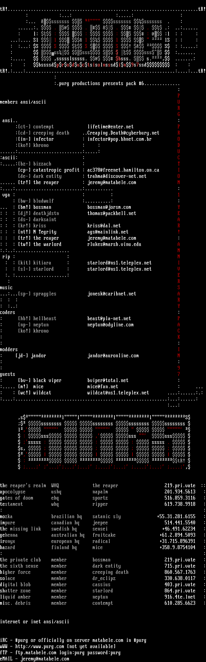 the reapers realm WHQ the reaper 219.pri.vate ::apocolypse ushq napalm 201.934.5613 :gates of doom ehq sportz 516.859.3116 :testament whq ripper 619.738.9918 :: :mozka brazilian hq satanic sly +55.31.281.6155 :impure canadian hq jeepee 514.441.5540 :the missing link swedish hq sensei +46.491.62234 :gehenna australian hq fruitcake +61.2.894.5093 :ironyx european hq radical +31.715.896391 :hazard finland hq mice +358.9.8754104 :: :the private club member bossman 219.pri.vate :the sixth sense member dark entity 715.pri.vate :higher force member creeping death 860.567.1763 :solace member dreclipz 330.638.0117 :digital blob member cassius 403.pri.vate :shatter zone member starlord 864.pri.vate :liquid amber member neptun 916.4te.lnet :misc. debris member contempt 610.285.6623 :