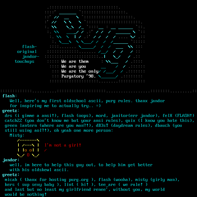 Well, heres my first oldschool ascii, purg rules. thanx jandor