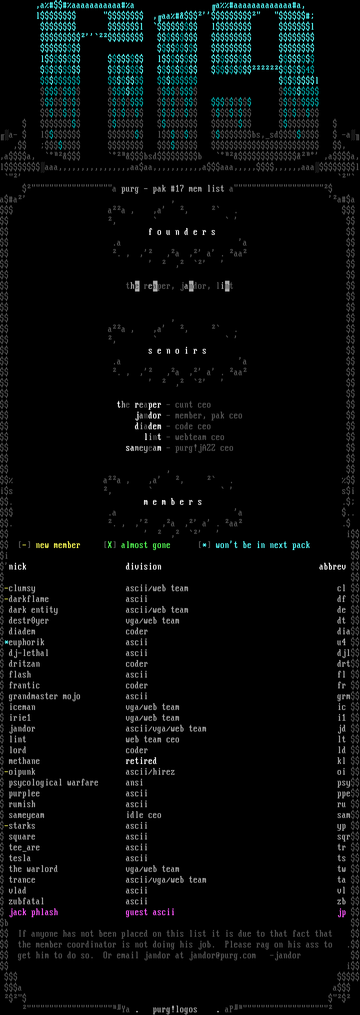 , i - new member X almost gone * wont be in next pack i nick division abbrev -clumsy ascii/web team cl -darkflame ascii df dark entity ascii/web team de destr0yer vga/web team dt diadem coder dia*euphorik ascii u4 dj-lethal ascii djl dritzan coder drt flash ascii fl frantic coder fr grandmaster mojo ascii grm iceman vga/web team ic irie1 vga/web team i1 jandor ascii/vga/web team jd lint web team ceo lt lord coder ld methane retired kl -oipunk ascii/hirez oi psycological warfare ansi psy purplee ascii ppe rumish ascii ru sameyeam idle ceo sam-starks ascii yp square ascii sqr teeare ascii tr tesla ascii ts the warlord vga/web team tw trance ascii/vga/web team ta vlad ascii vl zubfatal ascii zb jack phlash guest ascii jp b If anyone has not been placed on this list it is due to that fact that the member coordinator is not doing his job. Please rag on his ass to . get him to do so. Or email jandor at jandor@purg.com -jandor i a a